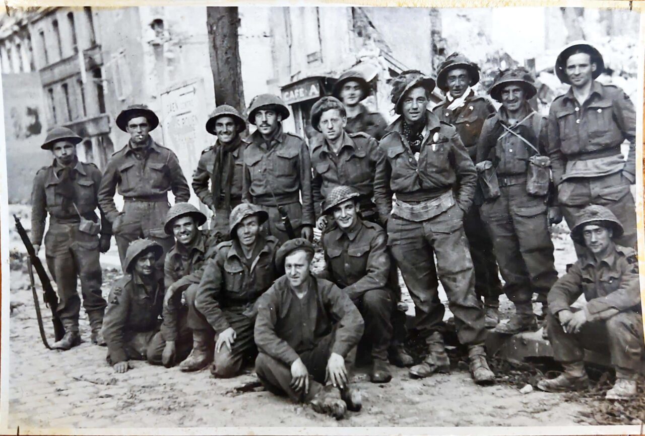 I could hear the phut-phut of a German mortar forward left of our position and the bombs falling close to where we were lying down. This went on for about half an hour, then a burst of M/G gunfire put paid to the German mortar. We were instructed to move on. We skirted the minefield and moved into a village called St. Aubin. We still had the collapsible bikes that we had landed with. We entered an orchard and I noticed a platform built in the branches of a tree. It had been a sniper’s hideout, but he had left in a big hurry. His smock with a wallet inside was still hanging on the platform.