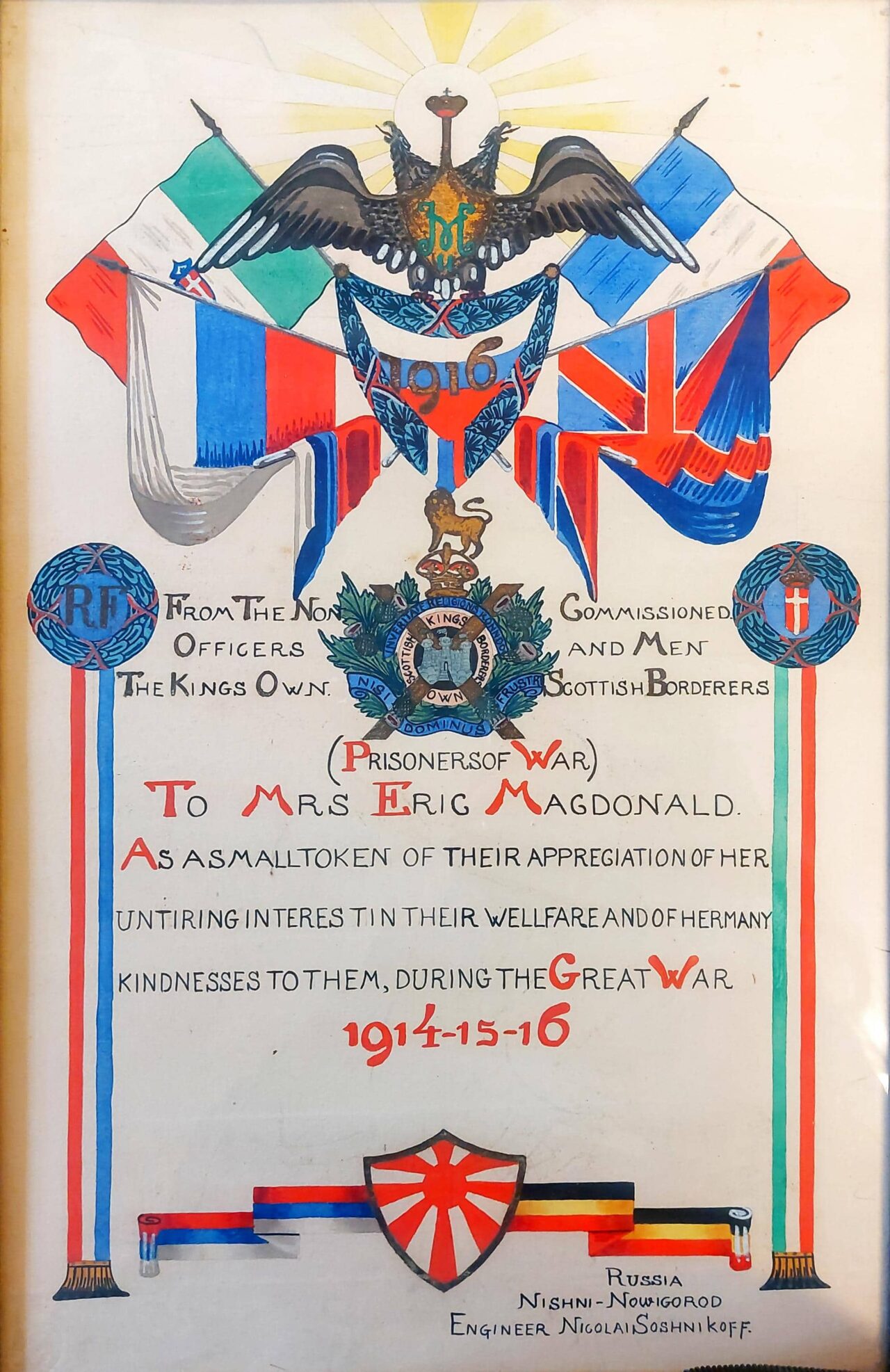 ‘Presented to Mrs Amy MacDonald by 300 repatriated prisoners of war of The King’s Own Scottish Borderers as a small token of their immense gratitude for the ceaseless and untiring work which she performed for their benefit from the beginning to the end of the war, 1914-1918’
